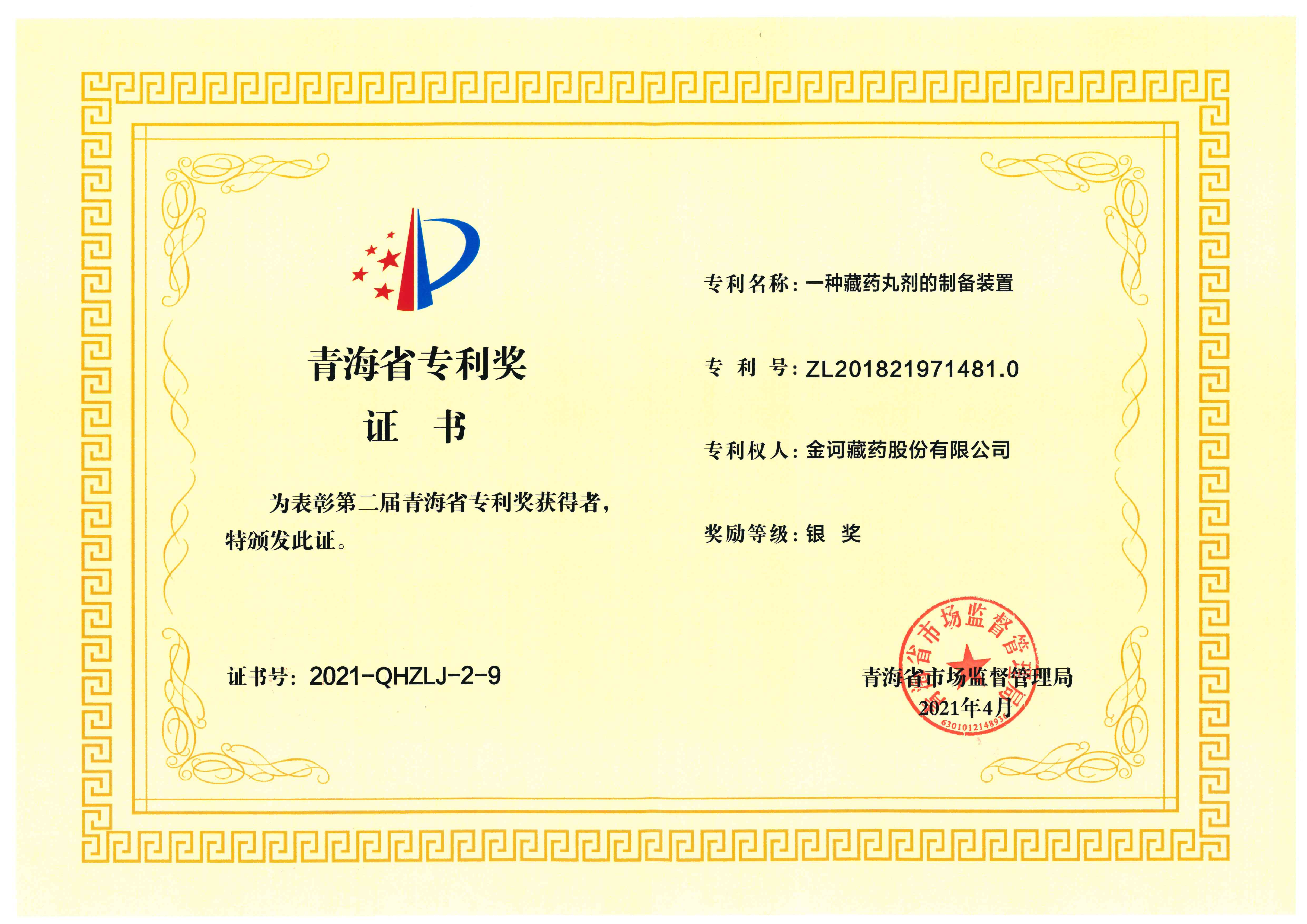 一種藏藥丸劑的制備裝置獲青海省專利獲銀獎(jiǎng)證書