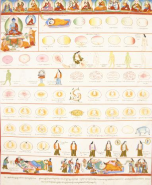 幅于1923年由第十三世達賴喇嘛的侍從醫(yī)生欽繞諾布主持增繪)?!端牟酷t(yī)典系列曼唐》是留存至今、藏族最系統(tǒng)、最全面、最詳細的人體醫(yī)學(xué)解剖圖和醫(yī)學(xué)教學(xué)掛圖,每幅由幾個至上百個小圖所組成,共包括